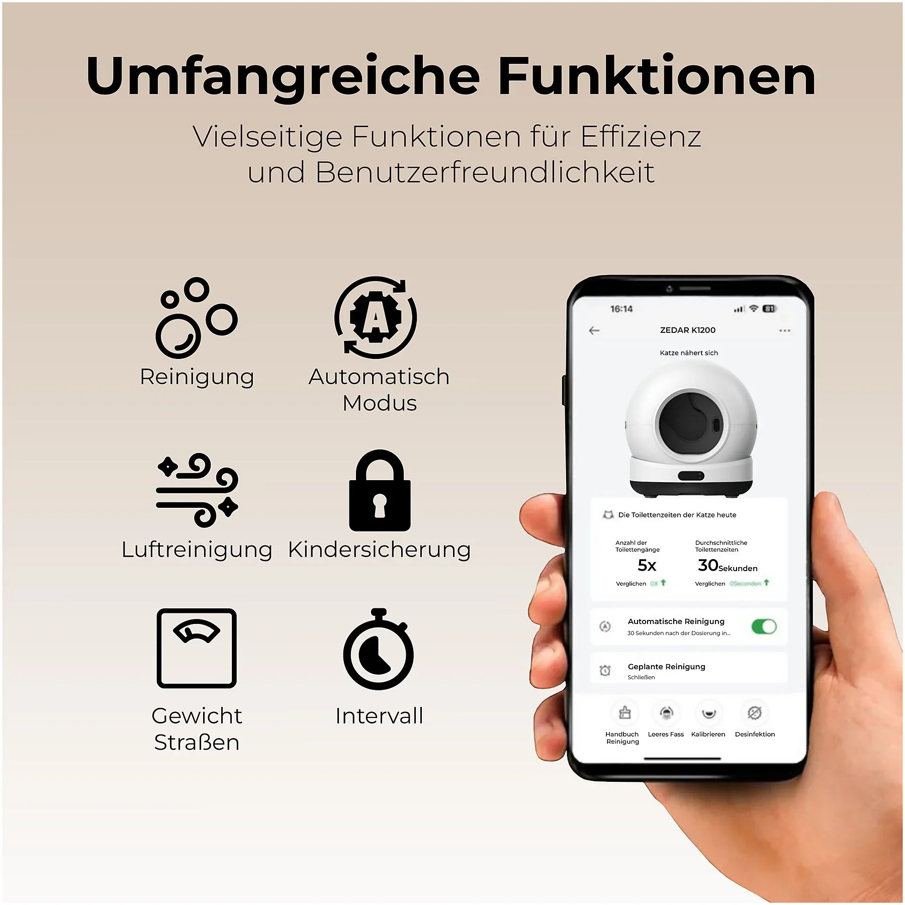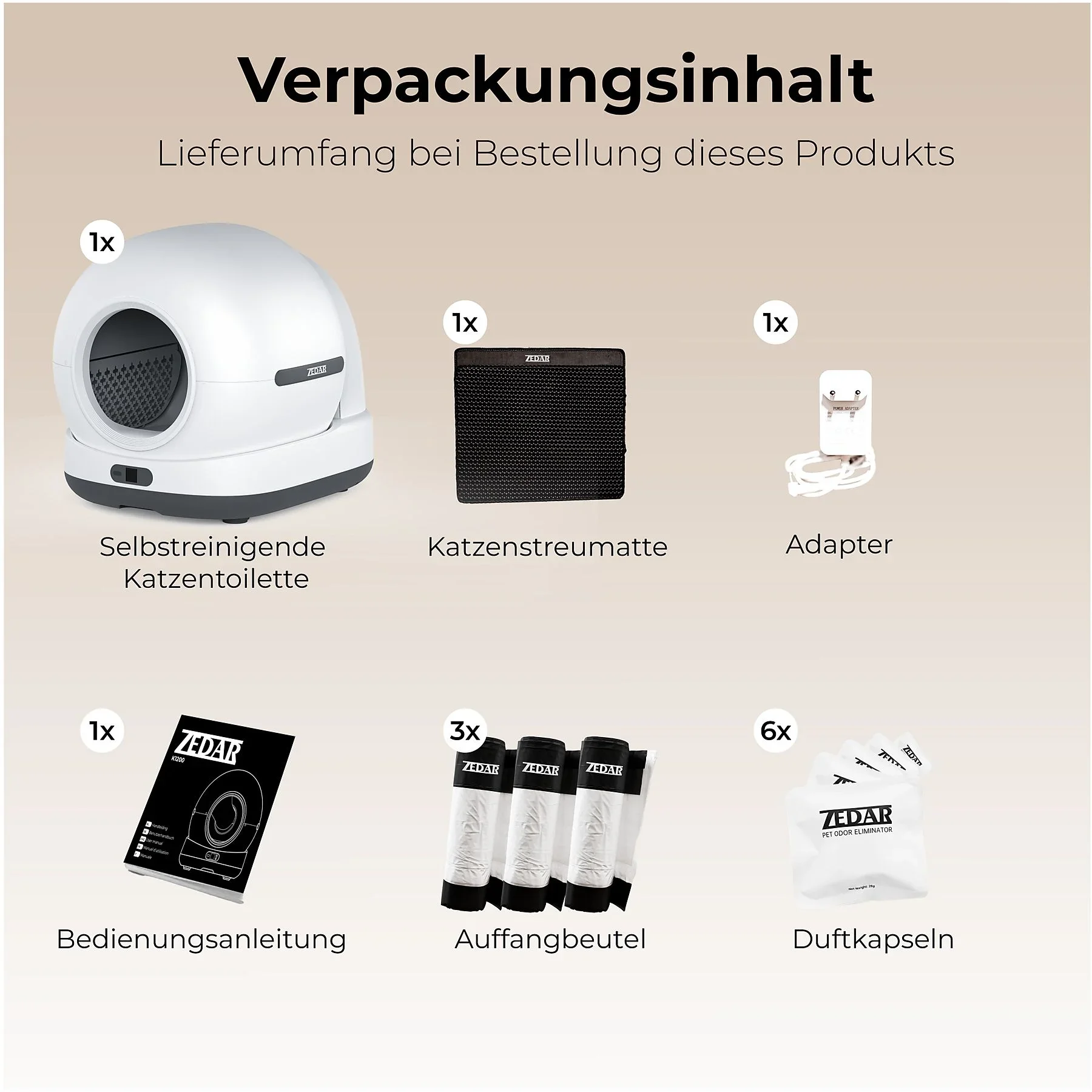 | Im Paket | Automatische Katzentoilette ZEDAR K1200 XXL, inkl. Auffangbehälter, Bedienungsanleitung |