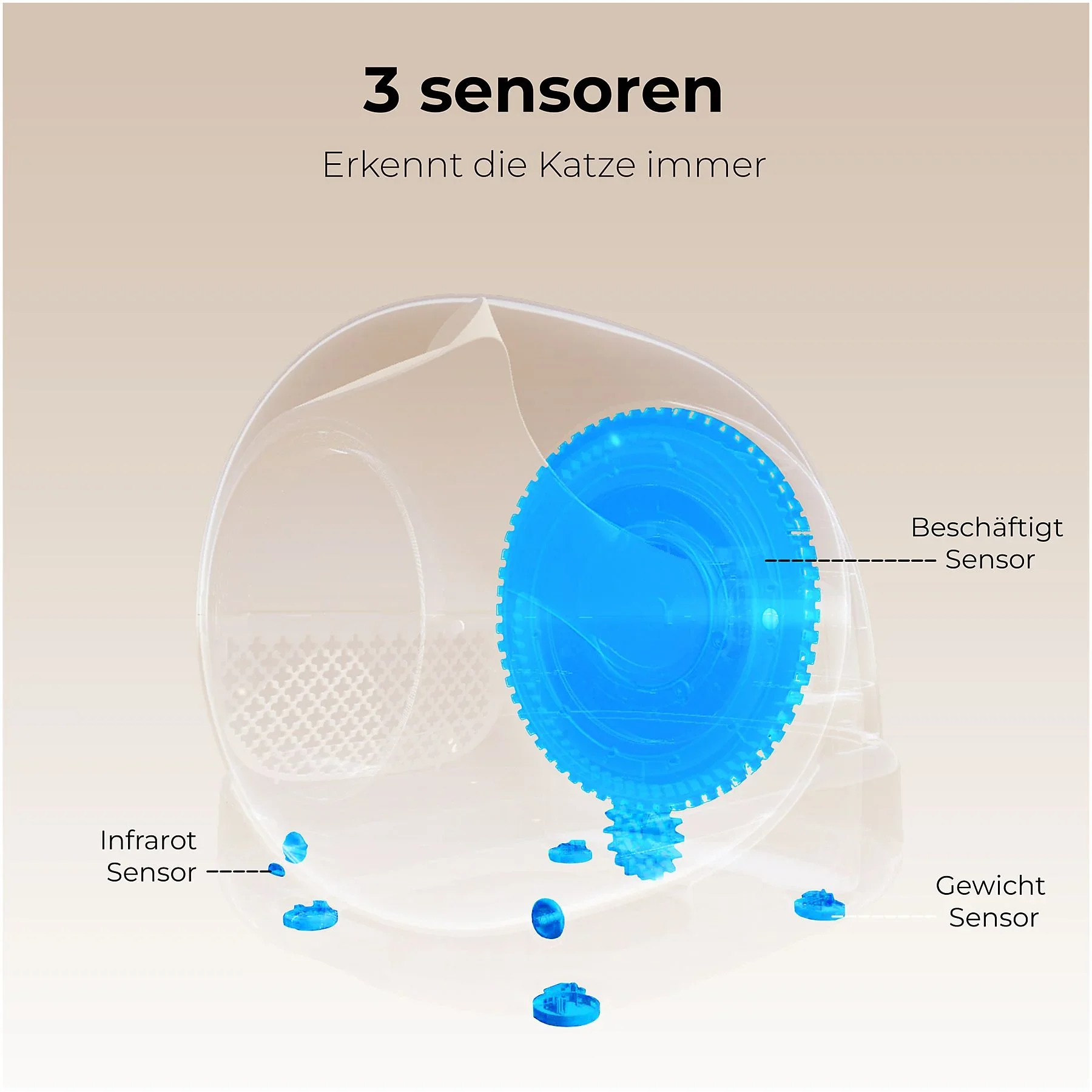 | Sicherheit | 360°-Erkennung – Start der Reinigung nur, wenn die Katze das Gerät verlassen hat |